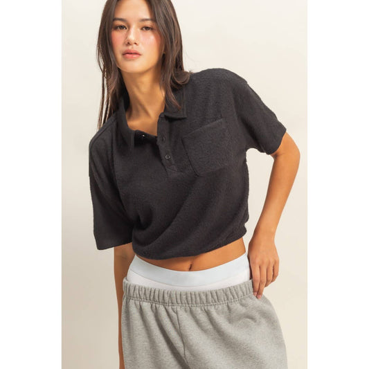 Collared Short Sleeve Crop Top: BLACK