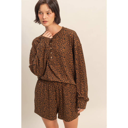 Leopard Print Henley Top & Shorts Set: BROWN