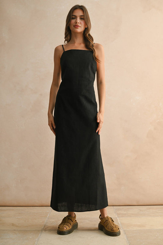LINEN LONG STRAIGHT DRESS: Black