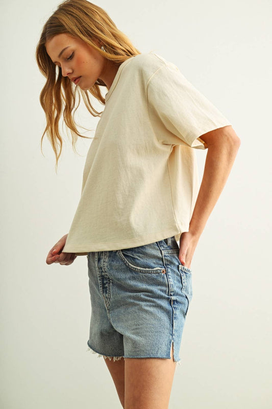 SHORT SLEEVE LINEN KNITTED TOP: OATMEAL