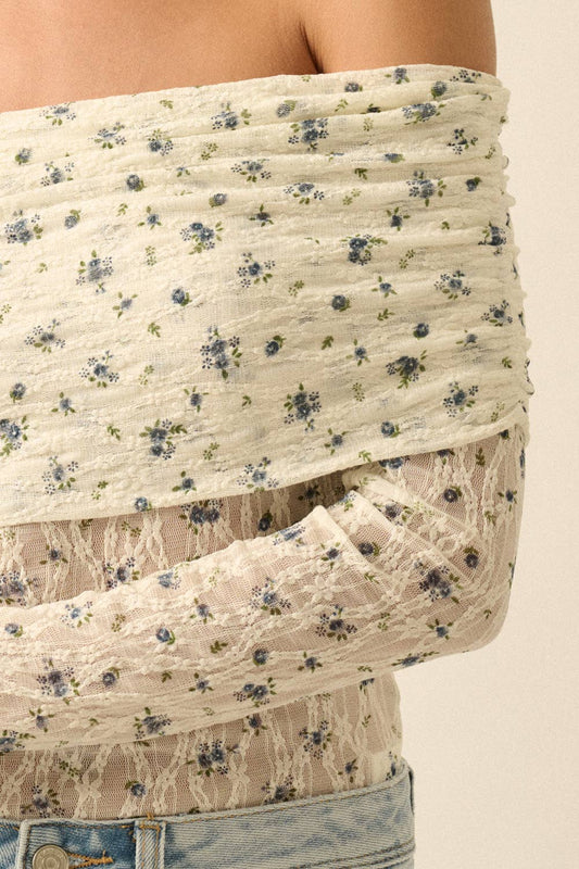 Floral-Print Lace Long-Sleeve Off-Shoulder Foldover Bodysuit: Cream