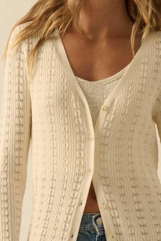 Pointelle Rib-Knit Trumpet-Sleeve Duster Cardigan: Cream