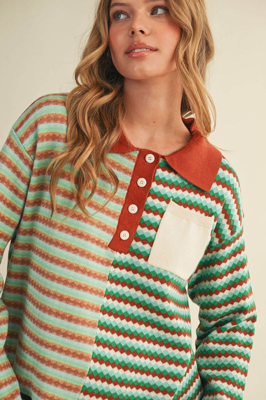 A striped sweater knit polo top: NAVY MULTI