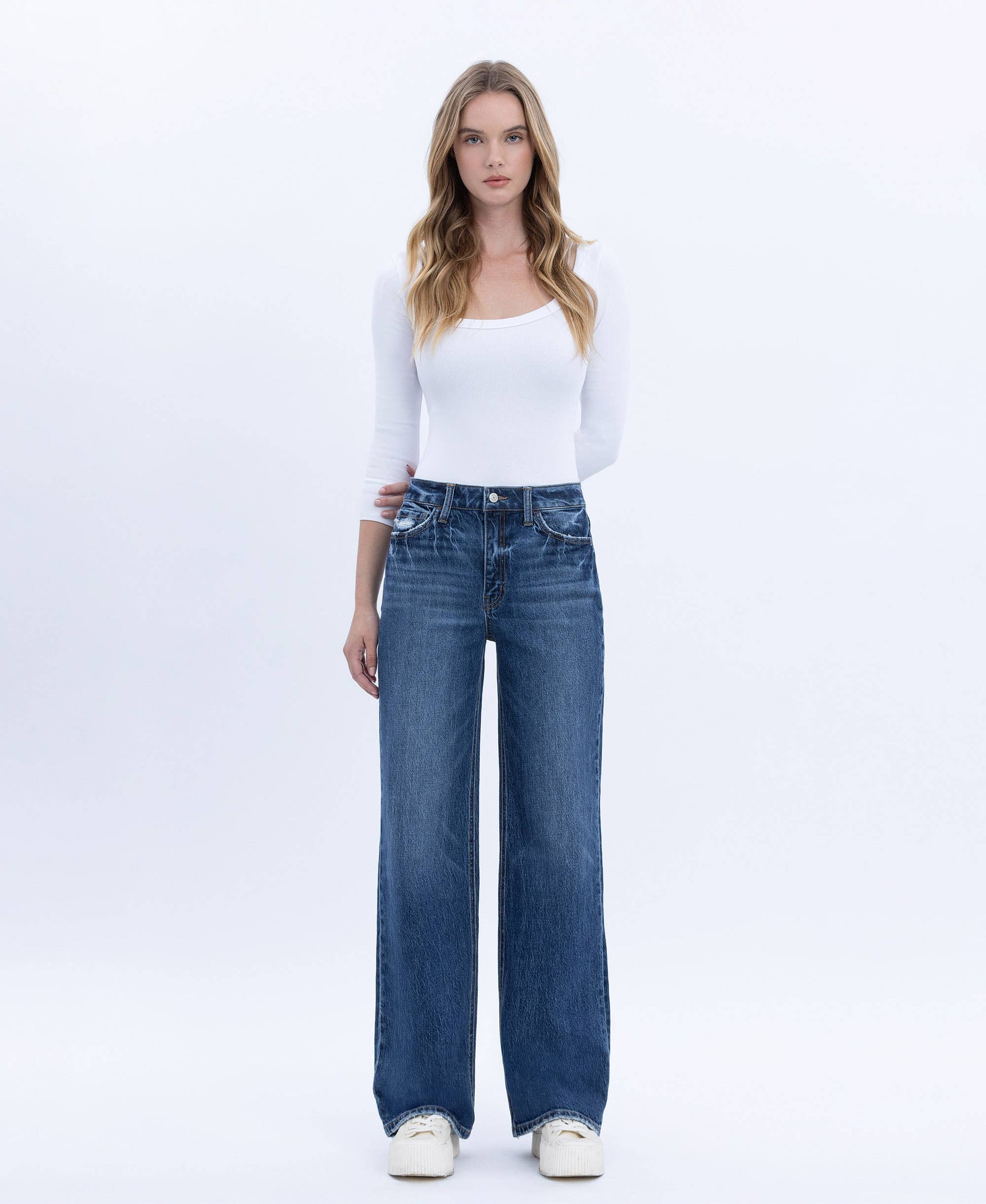 COMFORT STRETCH DENIM, SUPER HIGH RISE WAIST, LIGHTLY DISTRESSED DETAIL, FINISHED HEM, FULL LENGTH, 90'S WIDE JEANS