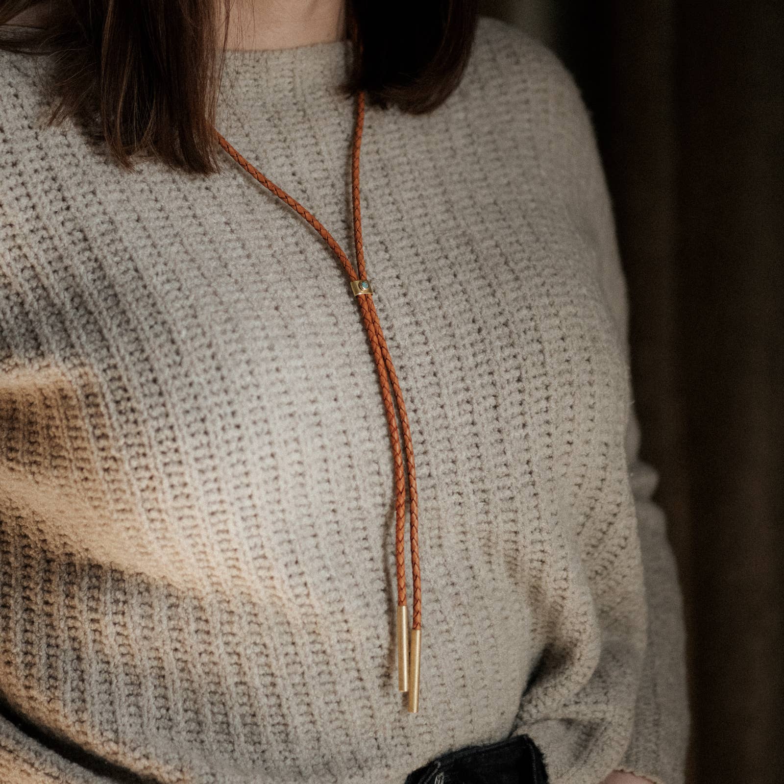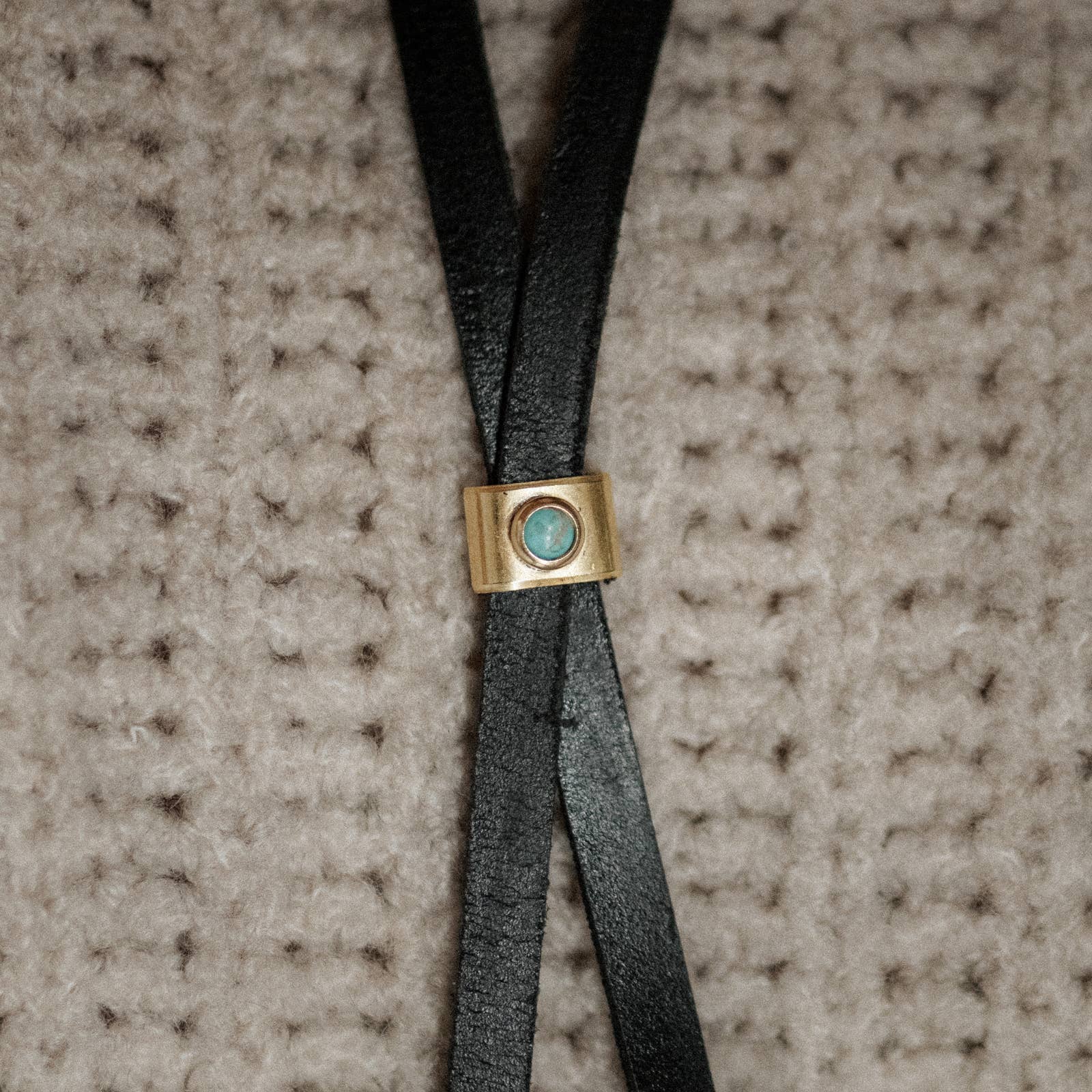 Braided or flat leather available in a variety of colors, connected by a small, adjustable, polished brass slider with or without a 4mm turquoise, pearl, or copper obsidian stone.
