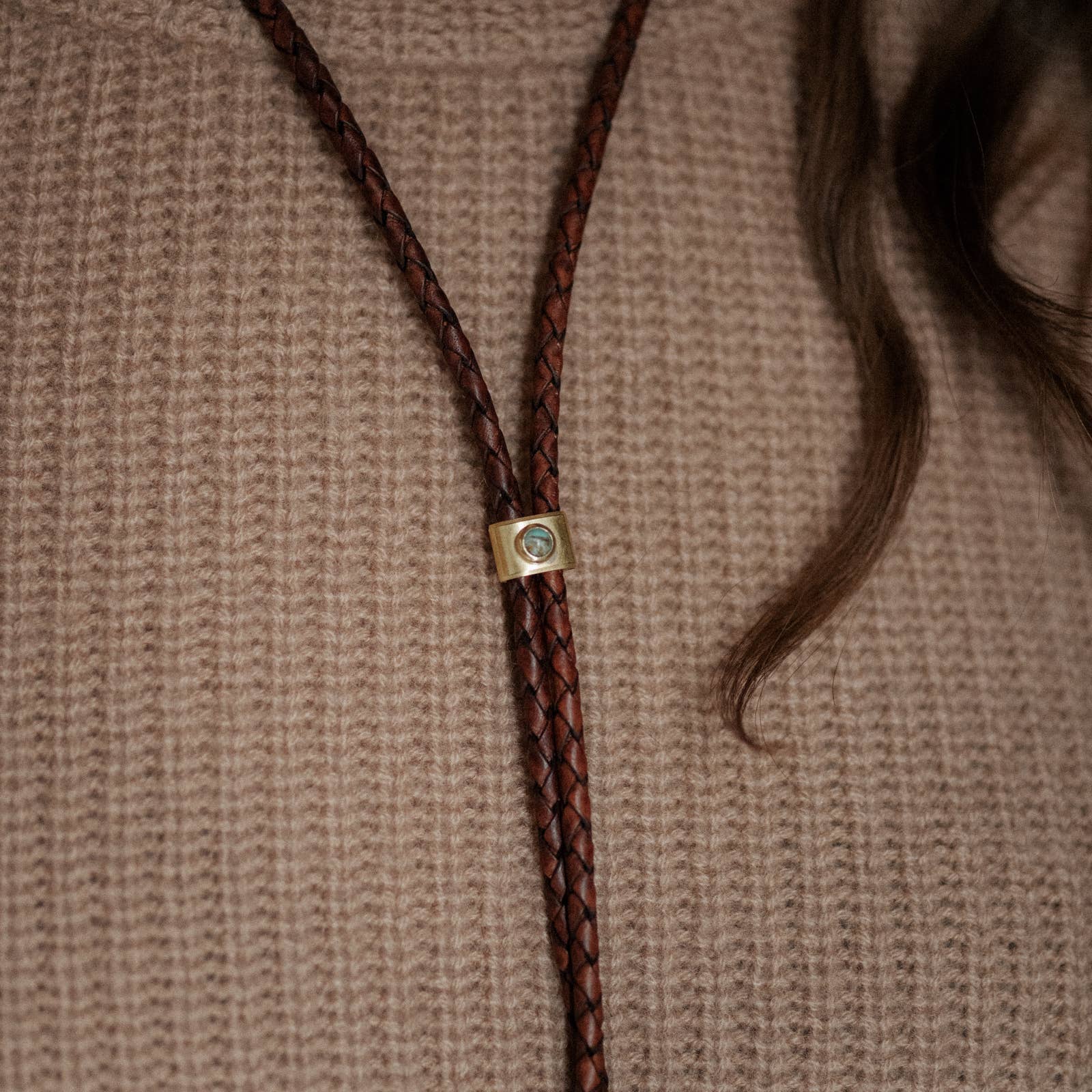 Braided or flat leather available in a variety of colors, connected by a small, adjustable, polished brass slider with a 4mm turquoise, pearl, or copper obsidian stone.