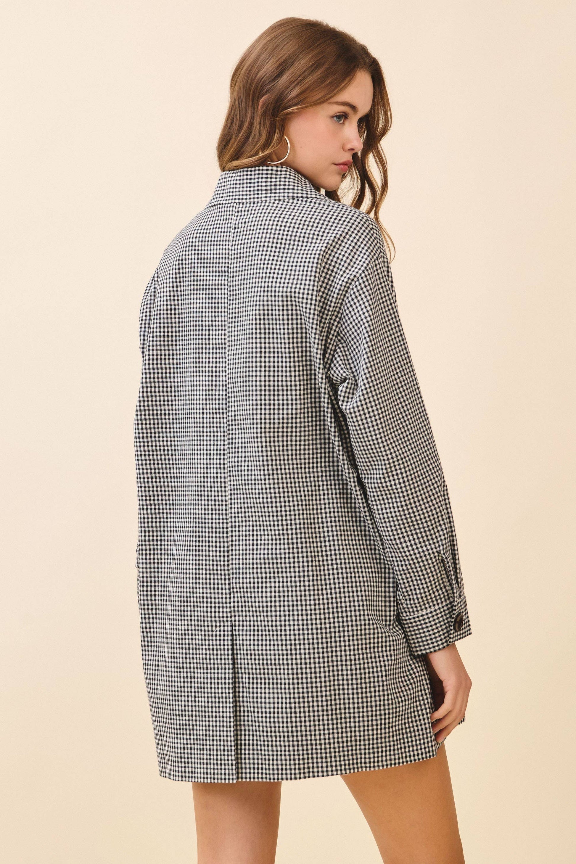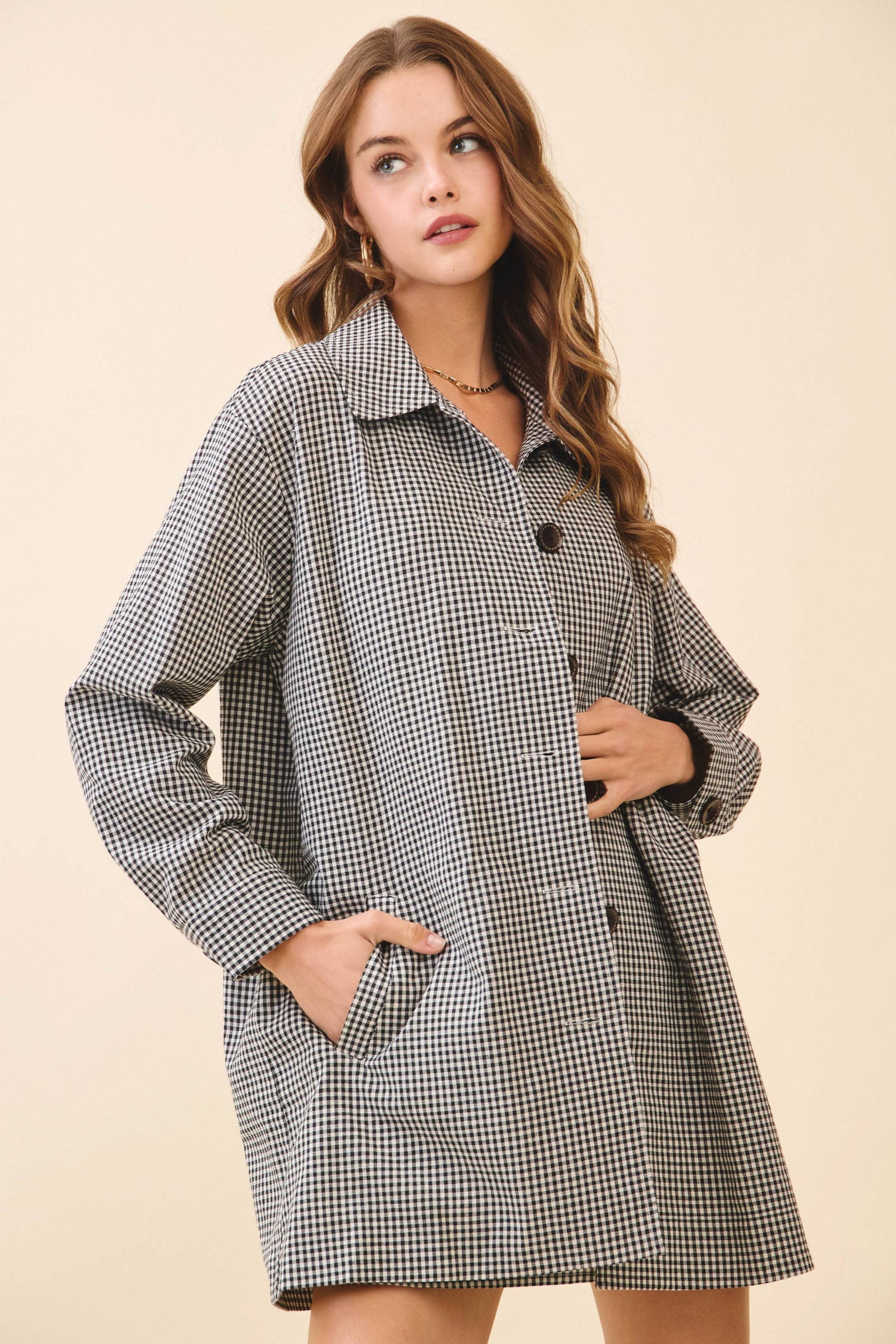 Gingham button-front jacket dress featuring a collared neckline, oversized fit, and side pockets. Detailed with large contrast buttons and long sleeves with button cuffs.