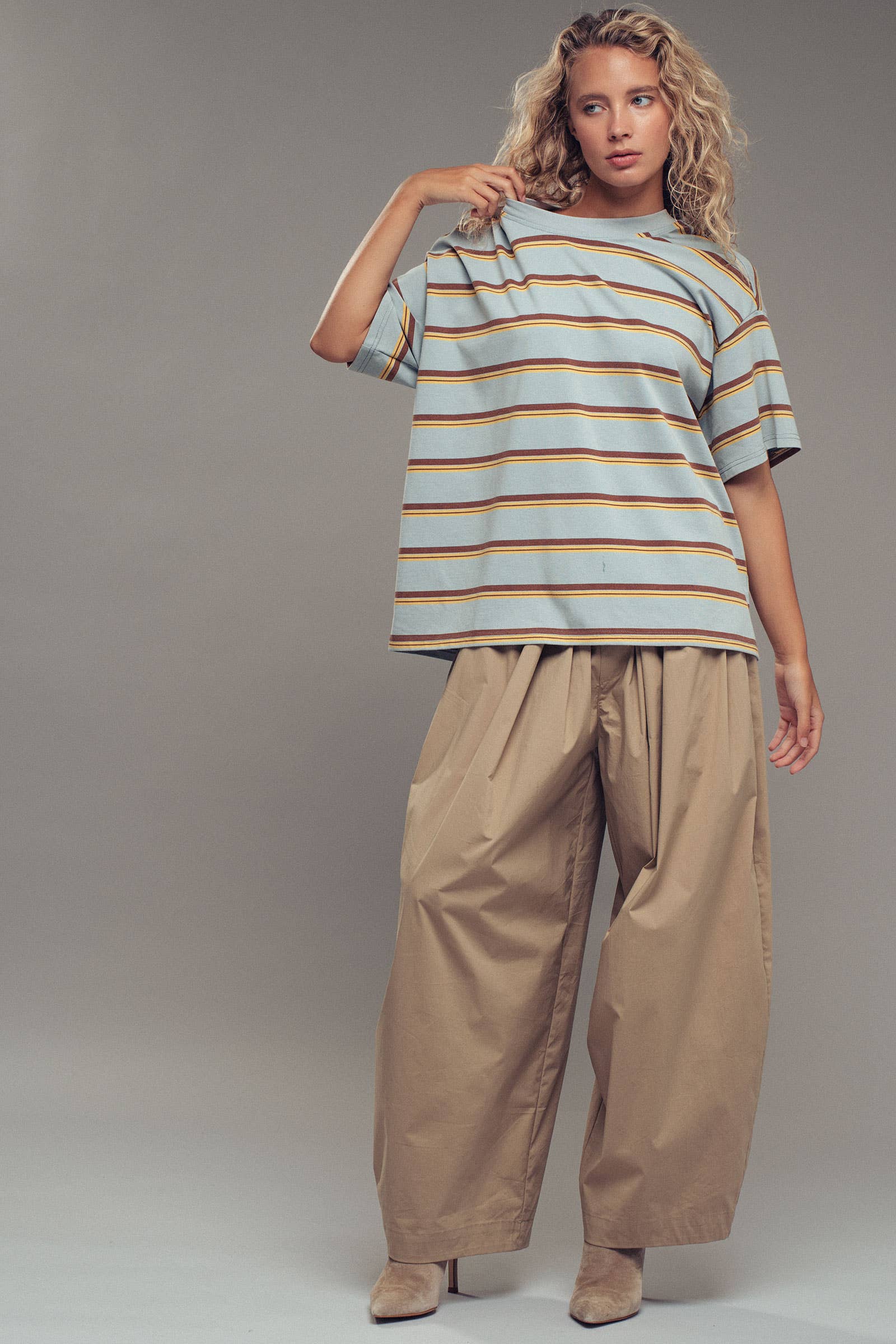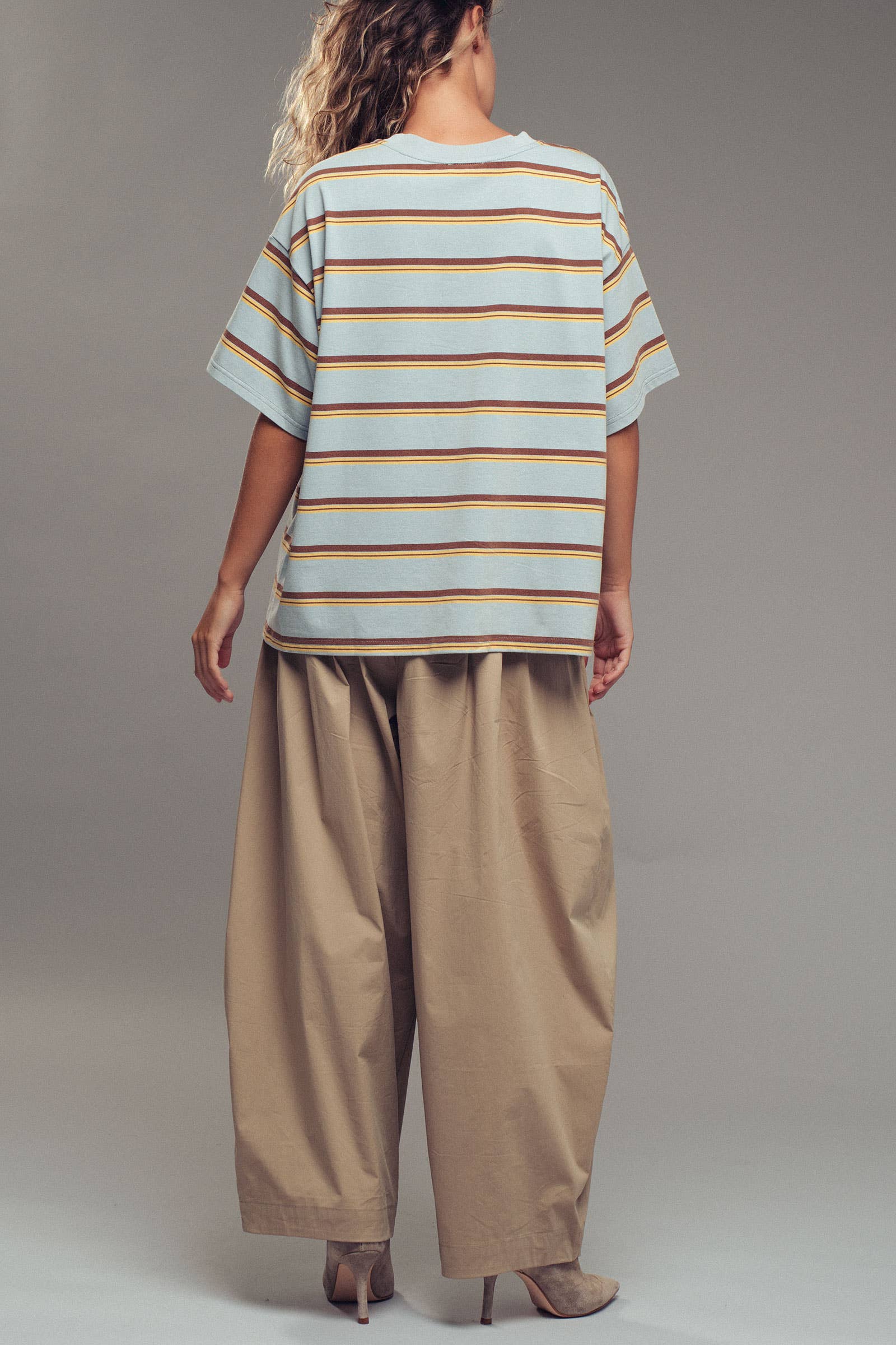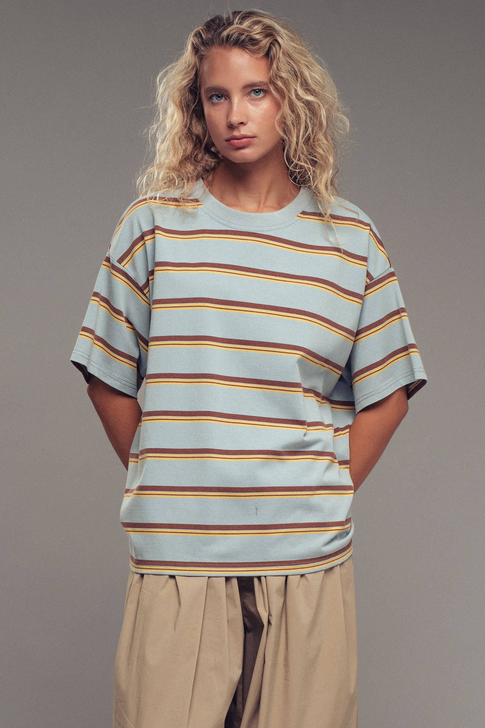 oversized western-inspired striped tee. Crafted from a soft cotton-poly blend, it features a loose, breathable fit and classic crew neckline—perfect for pairing with jeans, shorts, or layering over a maxi dress. Features: • breathable striped knit • Loose, oversized fit • Classic crew neckline The shirt measures approximately 25.2 inches across the bust and 27.5 inches in length when laid flat (measured on size Medium)