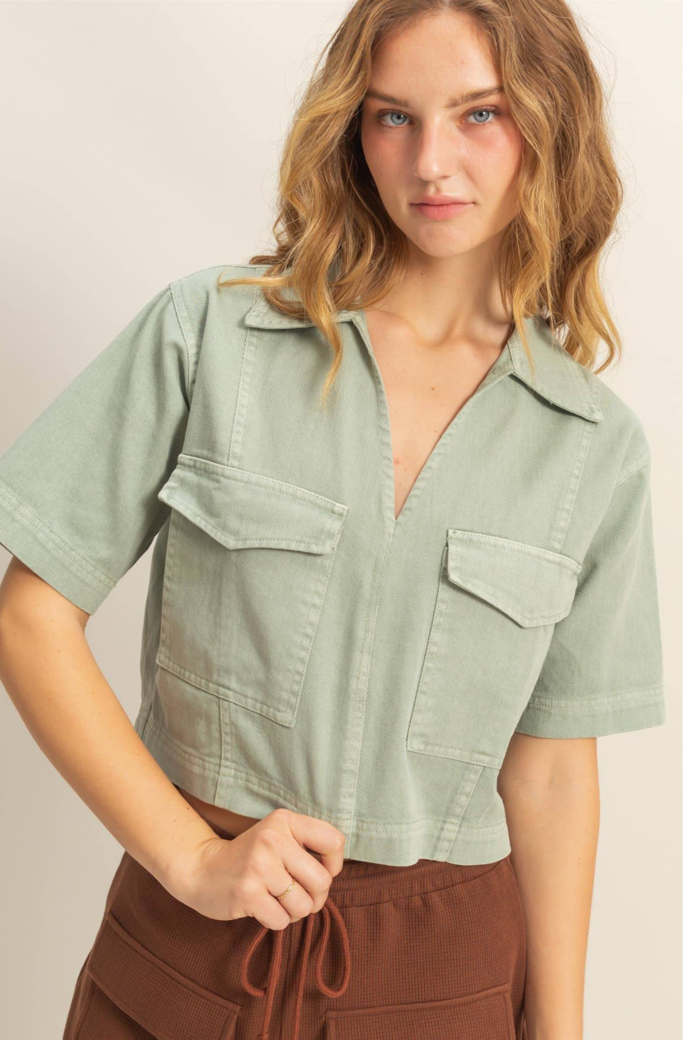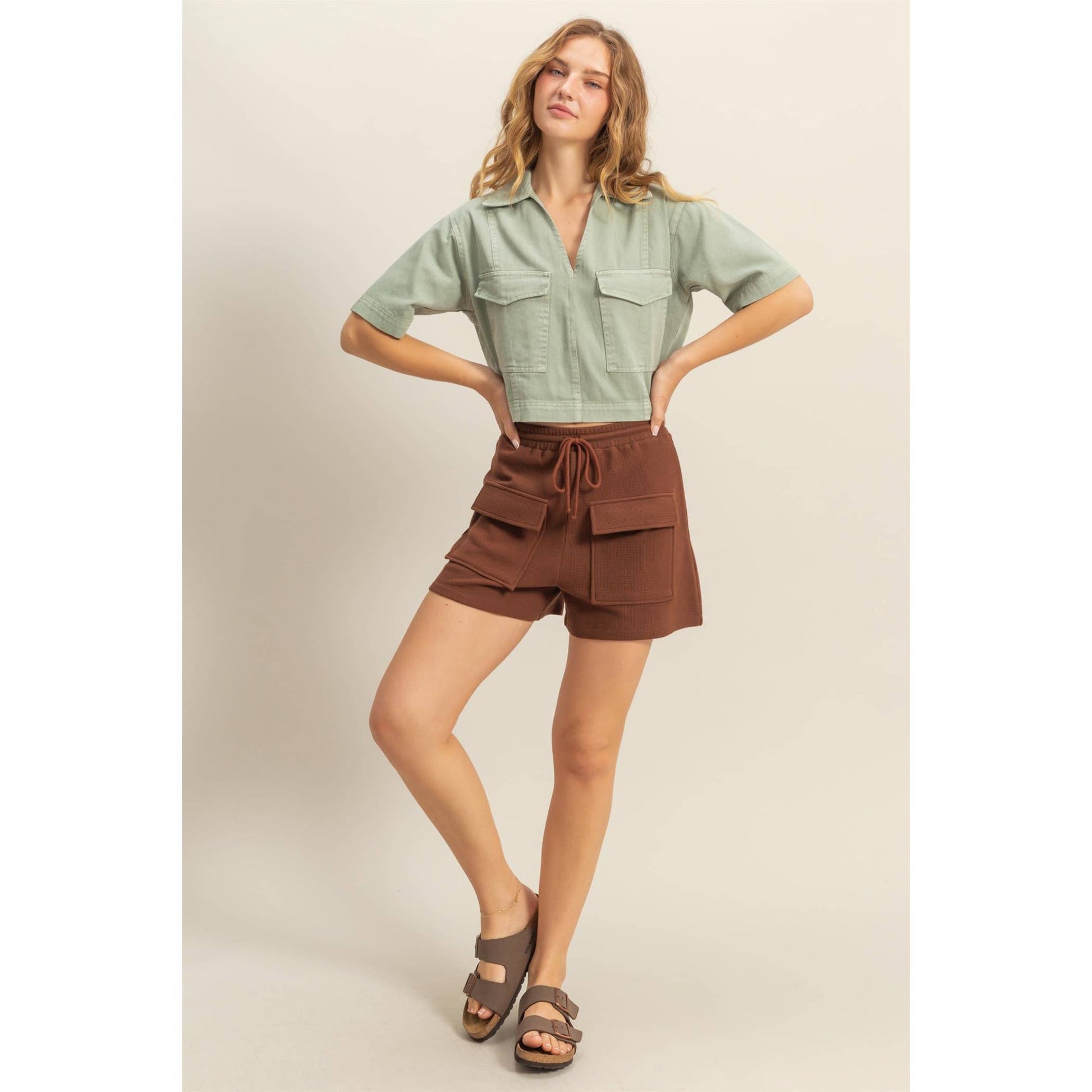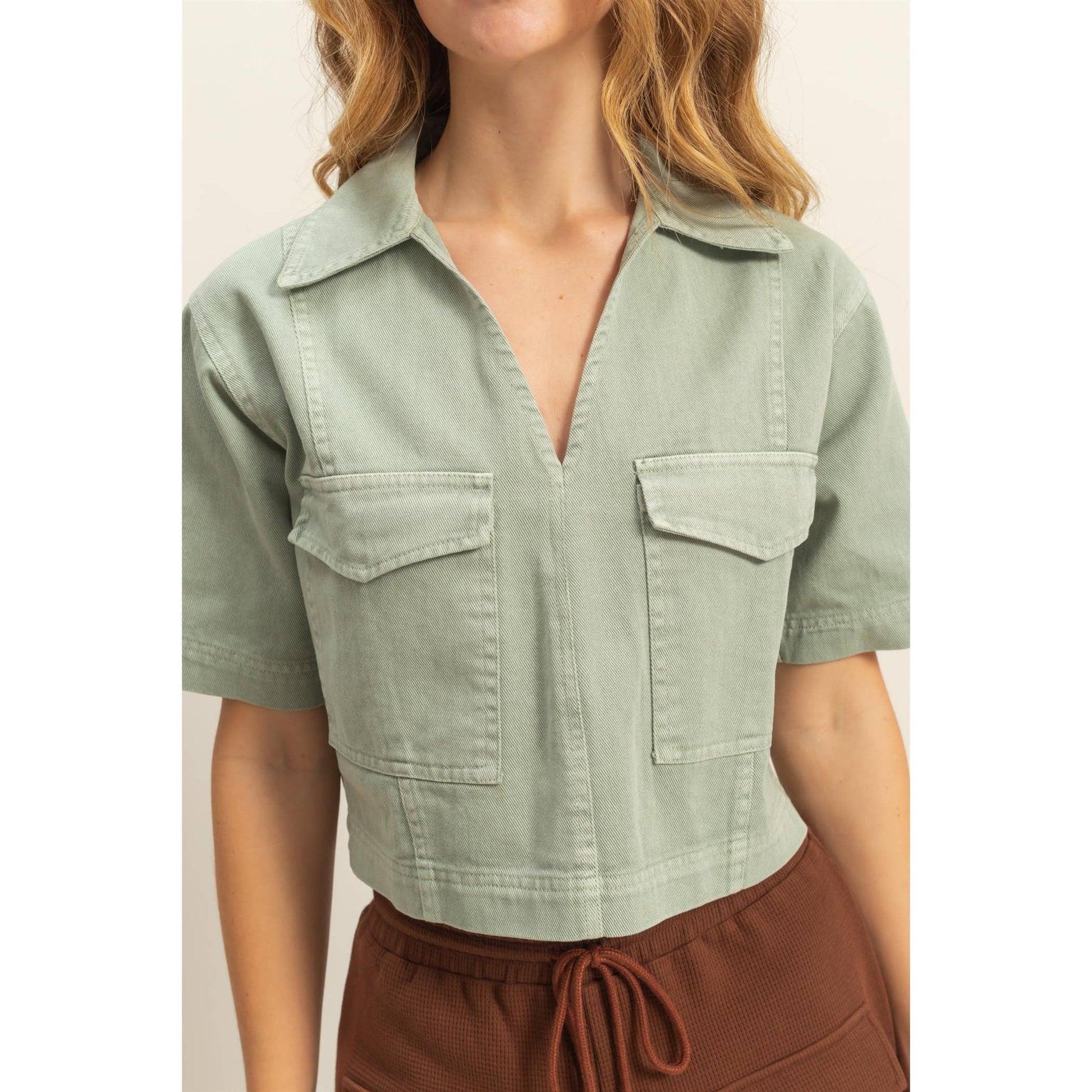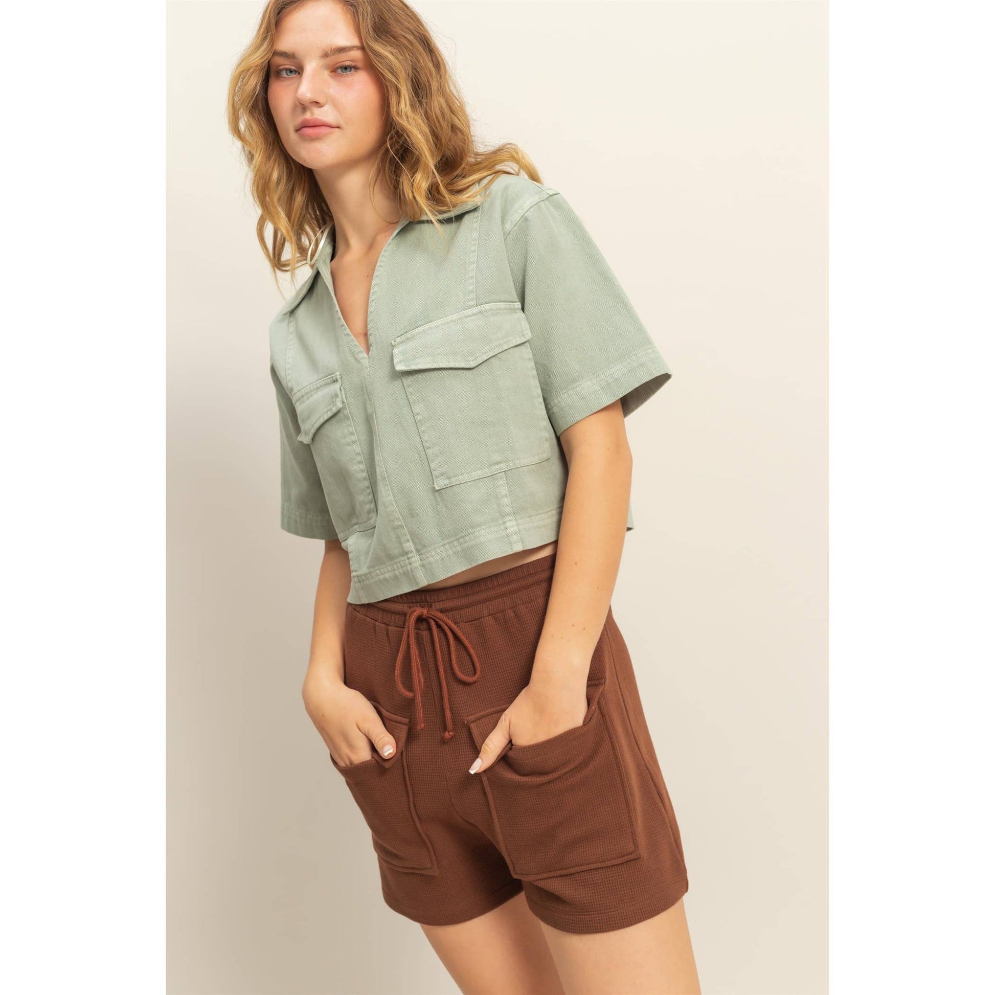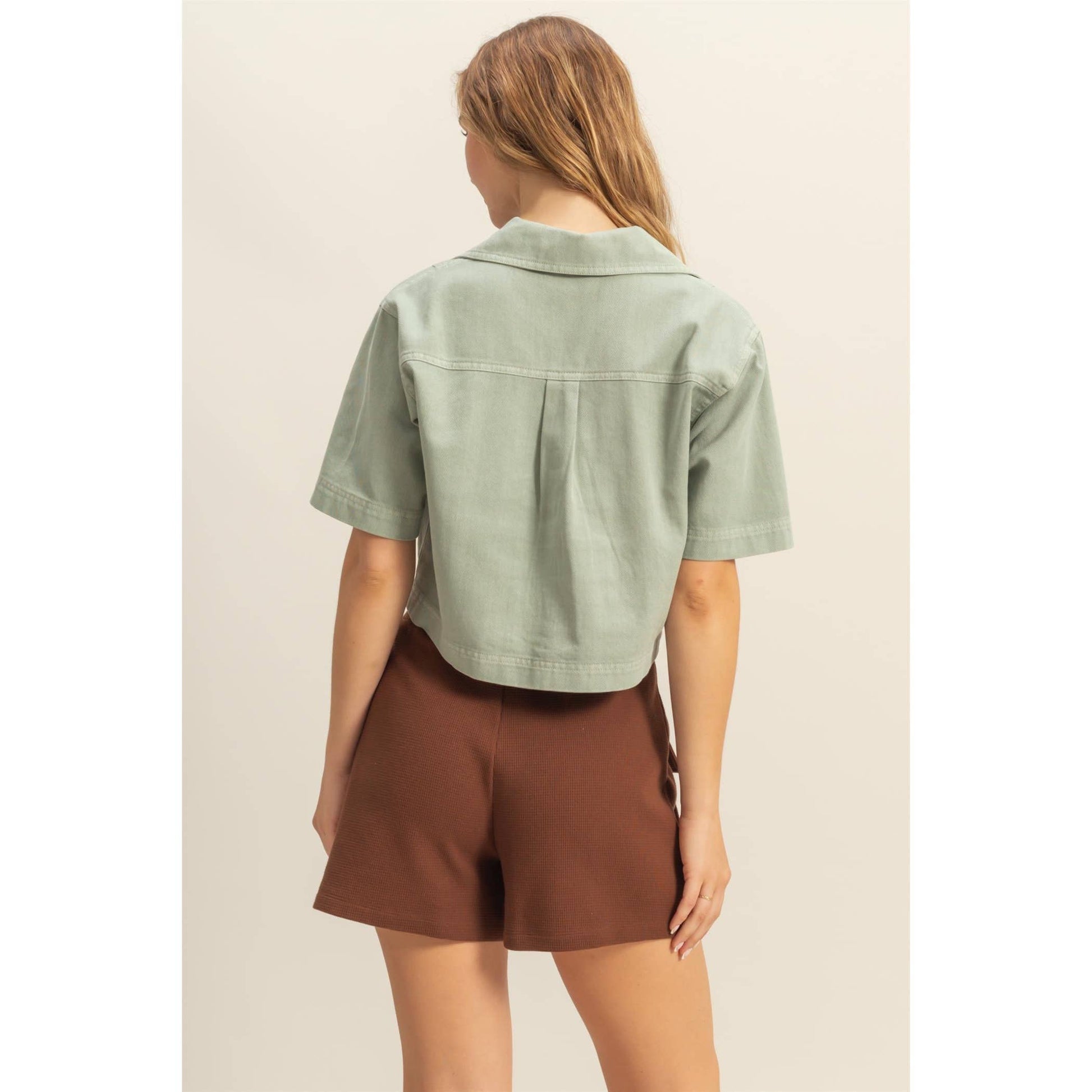 *This denim shirts is the best way to keep up with the trends. It has a collared v-neck, drop shoulders and short sleeves, attached to a relaxed bodice with flap pockets at the front. Style yours with high-waisted pants. 100% cotton Model is 5' 9" tall, 32" chest, 23" waist, 35" hips and wearing a size small Imported. Designed In The USA