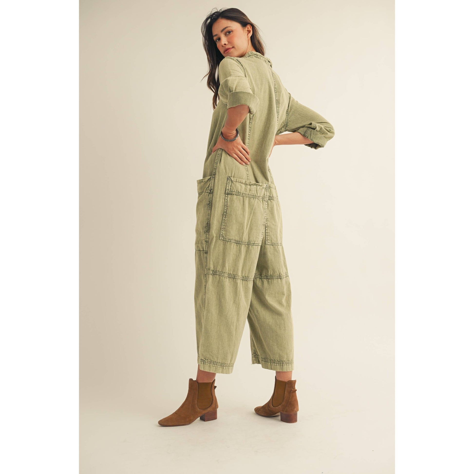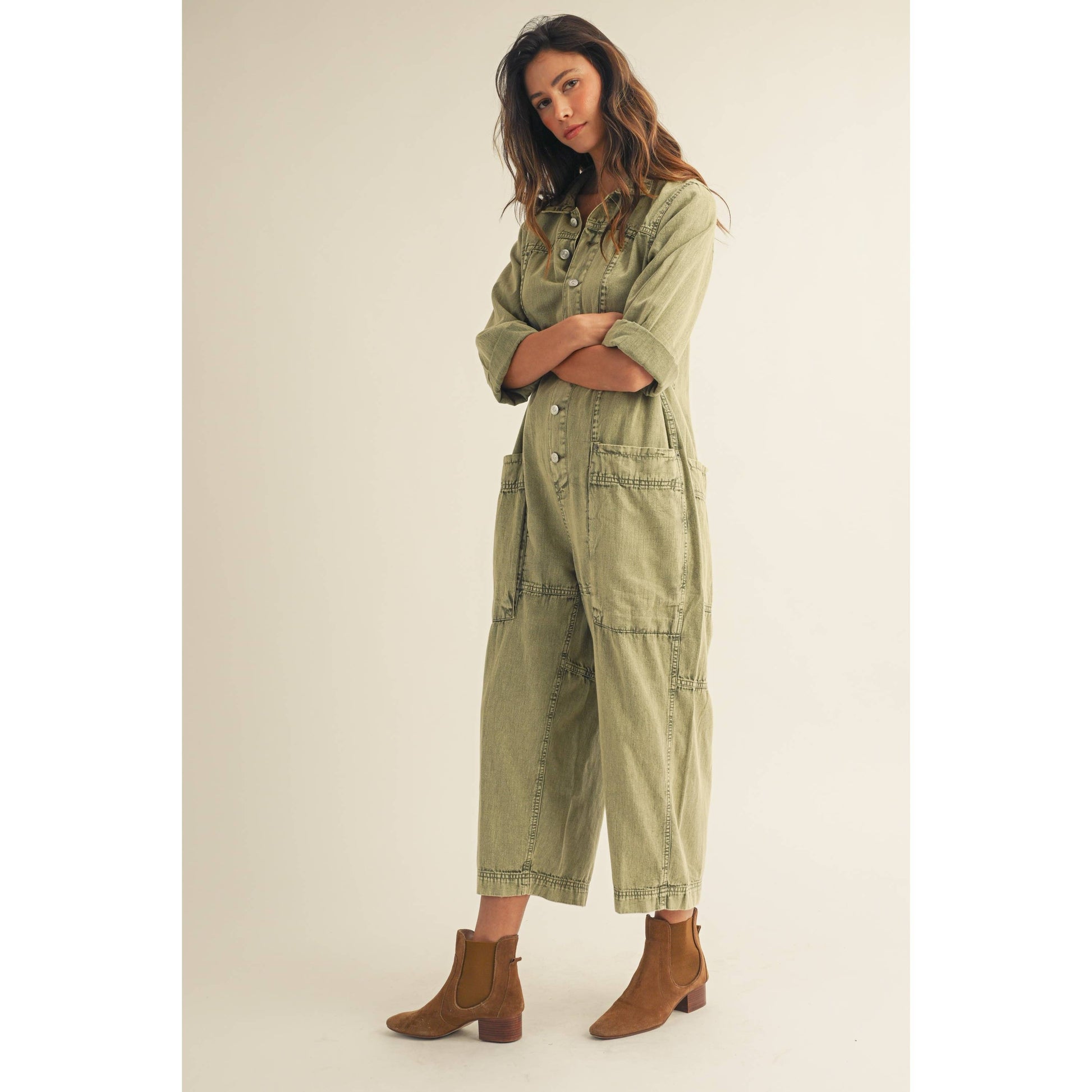 Washed Vintage Relaxed Button Jumpsuit: OLIVE GARDEN